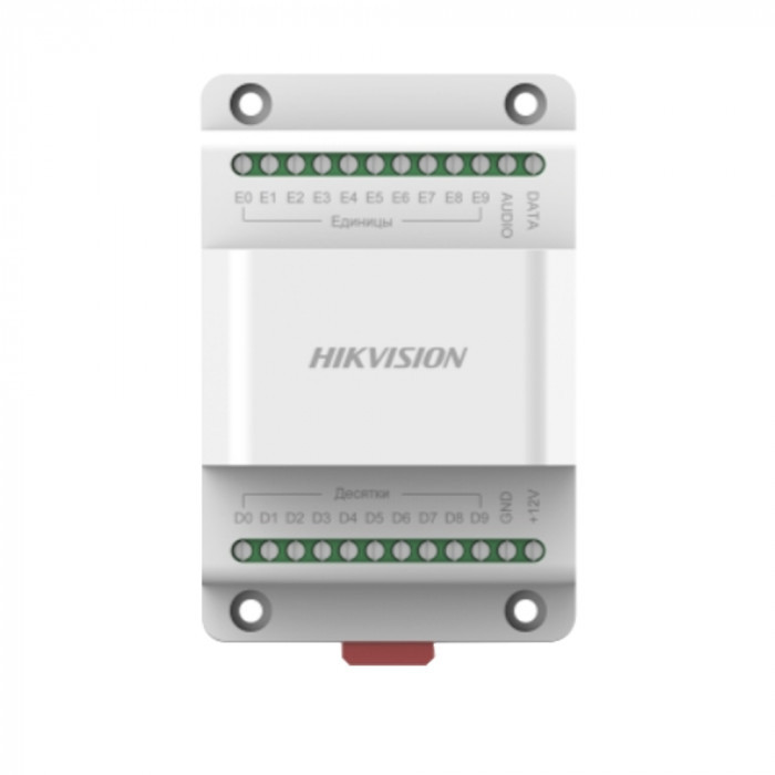 SIP Управляемый коммутатор, координатно-матричный на 100 Абонентов | Распределитель для DS-KD8013 | Интерфейс: 20×Контактов (внутренней станции) / 2×Контакта (дверной станции) / 1×Питание | Инсталляция: Настенный | Цвет: Белый | Применение: Внутреннее | Питание: DC 12V | Температура: -20°C...+50°C | Размер: 108×71×58мм