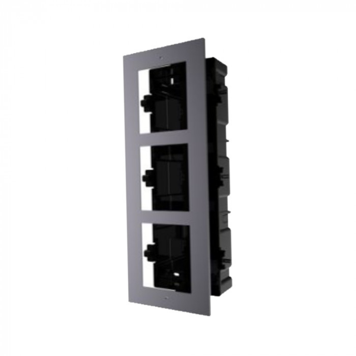 Кронштейн Hikvision DS-KD-ACF3/Plastic для врезного монтажа трех модулей вызывной панели видеодомофона Hikvision состоит из крышки и монтажной рамы. Крышка изготовлена из авиационного алюминия, монтажная рама — из пластика. В комплекте предусмотрен набор крепежных элементов. Рабочие температуры — –40 °C… +55 °C. Размер крышки — 337.8×124×4 мм, монтажной рамы — 338.8×134×56 мм. Вес — 420 г.