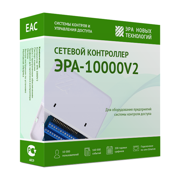 Сетевой контроллер «ЭРА-10000 v2» с подключением по сети Ethernet разработан компанией «Эра новых технологий» для обеспечения контроля доступа на объектах с численностью сотрудников не более 10000 человек. Он хранит в собственной памяти информацию о 160 000 событиях и сведения о 200 графиках проходов любой сложности. Устройство способно обслуживать одну полноценную точку прохода через интерфейс от Wiegand-4 до Wiegand-64 или две точки через Touch Memory. Идентификация пропусков происходит на основе Proximity карт или карт с чипом.